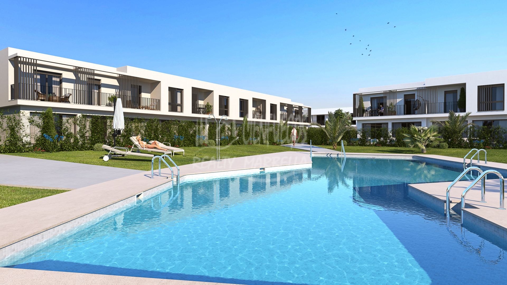 El conjunto dispone de 32 amplios adosados de 4 dormitorios con diferentes opciones de distribución interior, diseño moderno, estancias diáfanas con amplias terrazas y solárium en algunas viviendas. Aparcamiento para dos plazas en superficie. Se encuentra en primera línea de golf y las viviendas cuentan con doble orientación N-S. Zonas comunes ajardinadas y piscina con área de