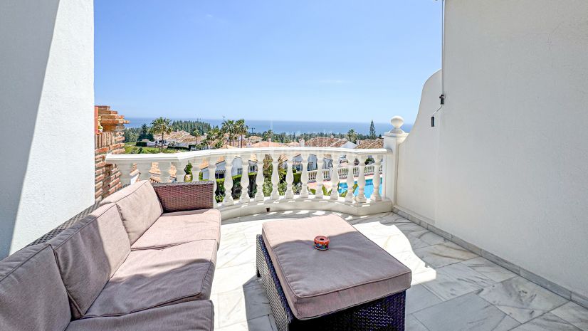 The living room is bright and offers access to the terrace with sea views. A pass-through connects the living area with the adjacent kitchen. The master bedroom also offers sea views and an en-suite bathroom with a bathtub and shower. The second bathroom has a shower and a laundry area with a washing machine and dryer – both bathrooms have windows. The complex consists of four buildings, each with four apartments, and a communal pool. A closed garage space is included in the price. The connections to Málaga and Marbella are excellent.