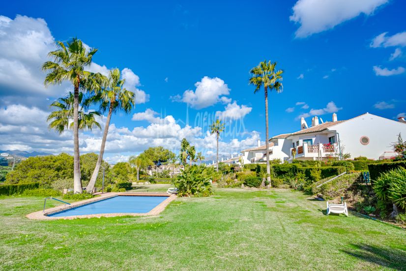 Lovely three-bedroom semi detached Villa in a gated community of Riviera Del Sol, the community has well kept gardens, two communal swimming pools, one of them being heated, and is a short walk to the beach and local amenities. The property has an open plan living and dining area with a built-in fireplace and access to the spacious terrace with views to the mountains, golf and pool; fully fitted kitchen; and guest toilet. The lower-level leads to the master suite with access to the private garden; two guest suites; and access to the private double garage. Other features include hot and cold air conditioning, electric shutters and fitted wardrobes. A great reform opportunity in a residential community.