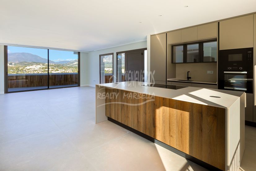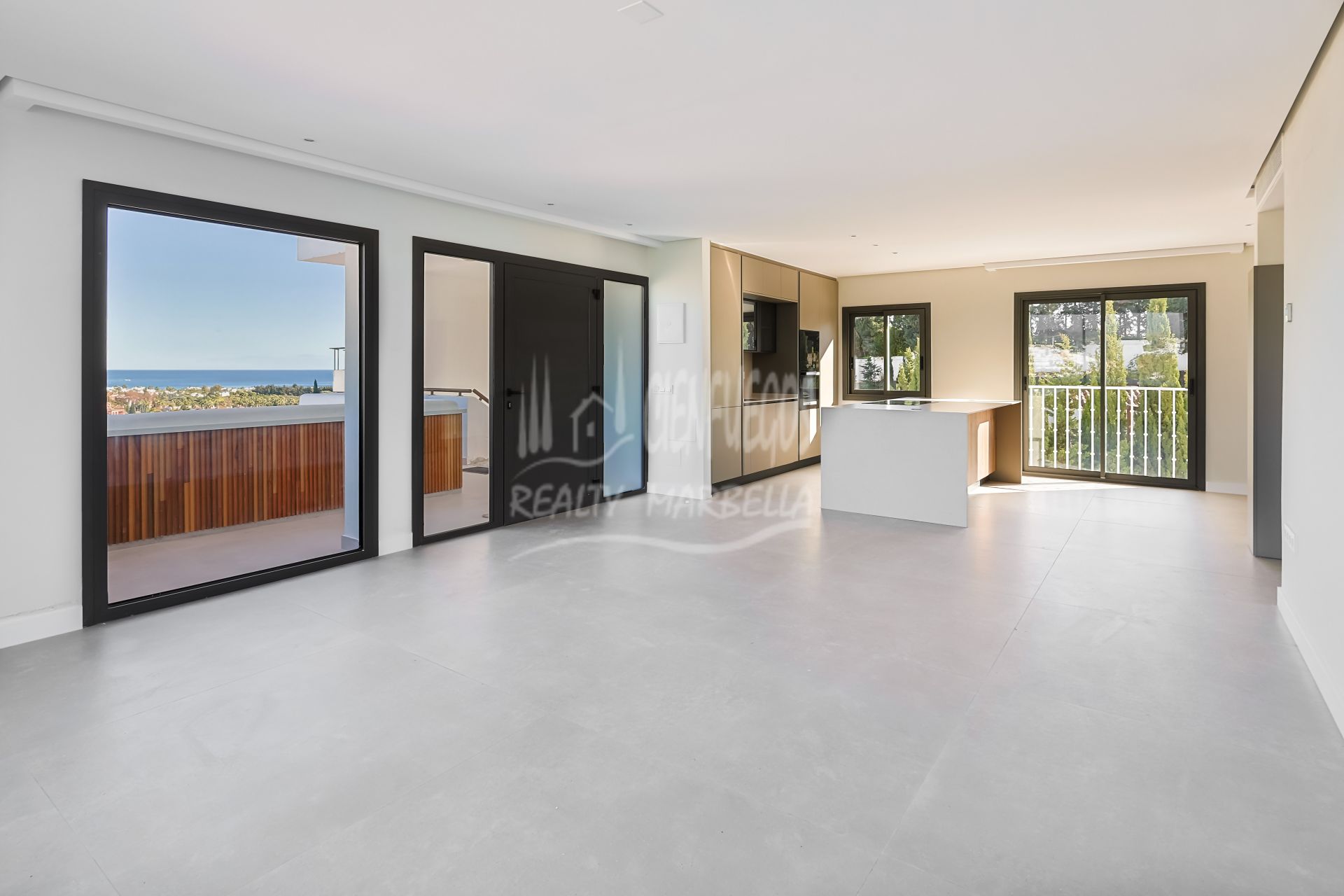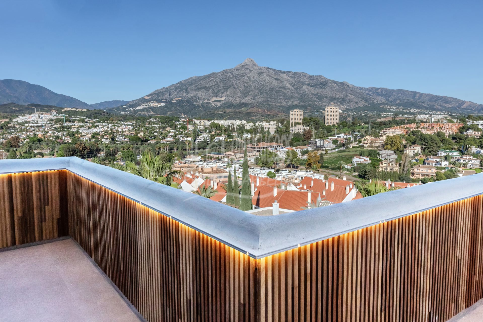Incredible opportunity to purchase a two bedroom penthouse in the gated community of Jardines de Andalucía, Nueva Andalucia. This property has been renovated to the highest standard, with a spacious and bright open plan kitchen and living/dining area. There is one guest bedroom and bathroom, plus a large master en-suite. All the rooms have direct access to a private terrace with incredible views of La Concha Mountain and sea views. Other features include; fully fitted wardrobes, air-conditioning, electric blinds, one private parking space and storeroom. The complex itself is close to all leisure amenities, golf courses and beaches, making it a great holiday rental or year round home. There are several units for sale with options for reform or key ready apartment.