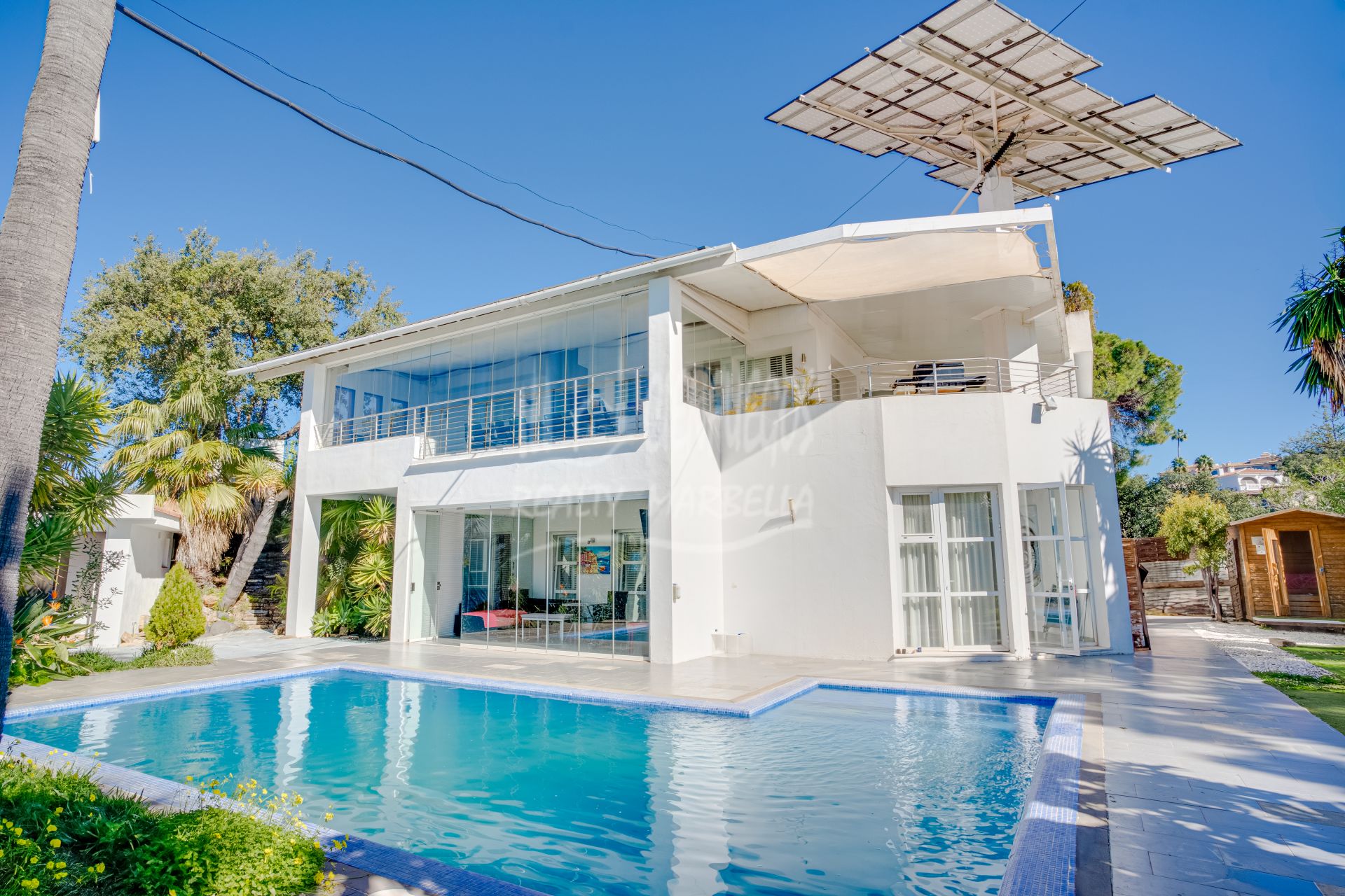 Unique eight bedroom south facing villa, in a tranquil area of Elviria, Marbella. Located close to the beach, schools and local amenities, this fantastic property is also a successful operating Bed & Breakfast. The property consists of the main house, two apartments with independent access and an additional two bedrooms with access from the garden. The house is equipped with everything you would need for year-round living or holiday rentals including a heated swimming pool, golf putting green, outdoor sauna, and BBQ area. The terrace and solarium boast stunning sea views. Other features include hot and cold air conditioning, private parking space, storage area and solar panels that supply the electricity to run the whole property, as well as a back-up generator.