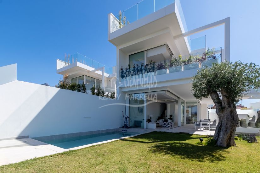 Imagine your life in Marbella, enjoying more than 320 days of sun a year.. The Ground Floor offers a spacious living-dining-kitchen open and elegant design, while the First Floor houses three bedrooms with en-suite bathrooms and private terraces. And to culminate, a solarium on the Terrace Floor with an indoor area and a toilet, all accessible by lift. In addition, its two parking spaces in the basement floor with direct access to the villa and independent elevator ensure maximum comfort.