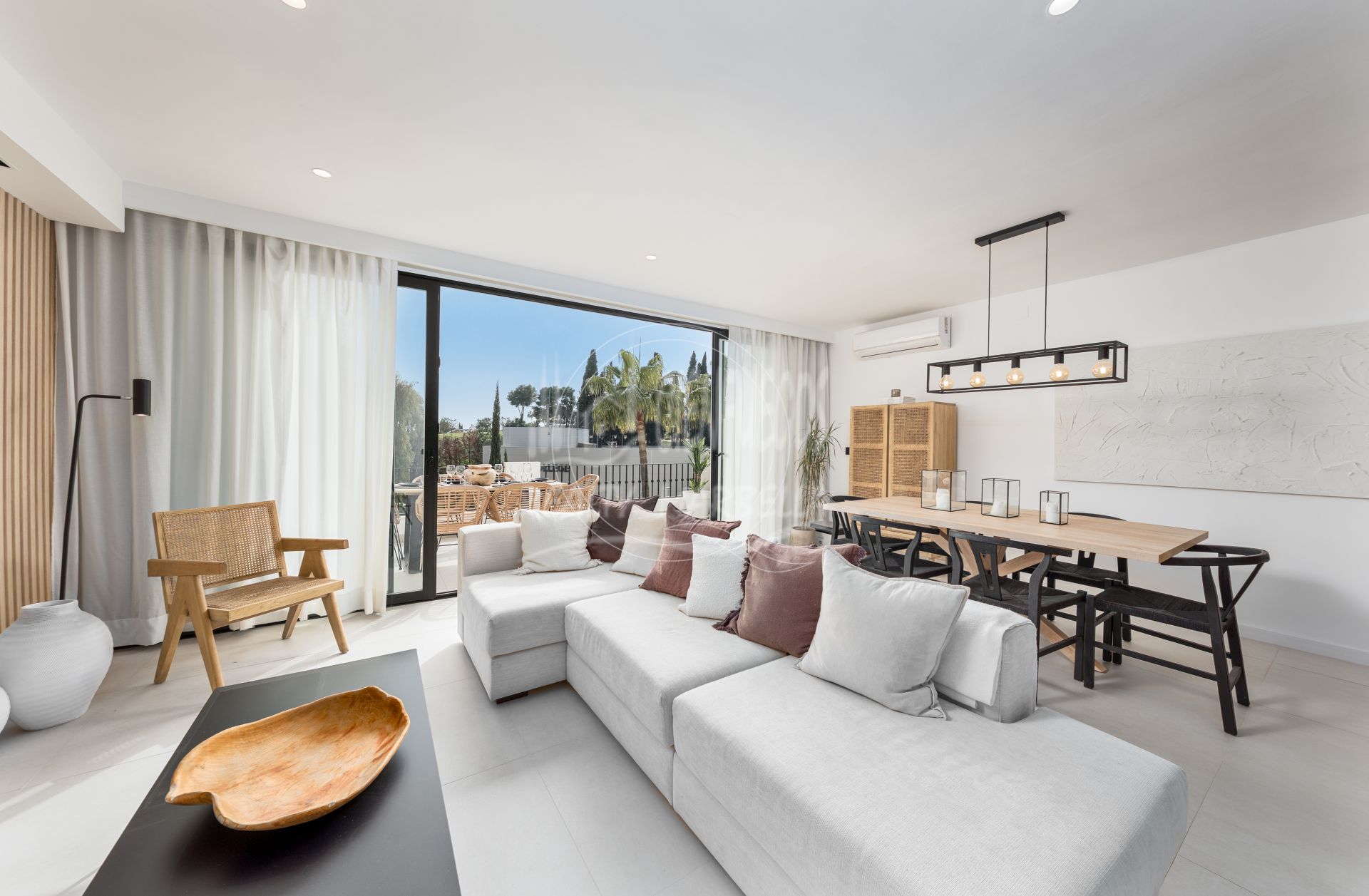 This renovated townhouse in Pinos de Aloha combines modern comfort with Mediterranean charm. Located in a quiet residential area near Aloha Golf Club, it offers a peaceful setting while being close to Puerto Banús, shops, and international schools, including the prestigious Aloha College.