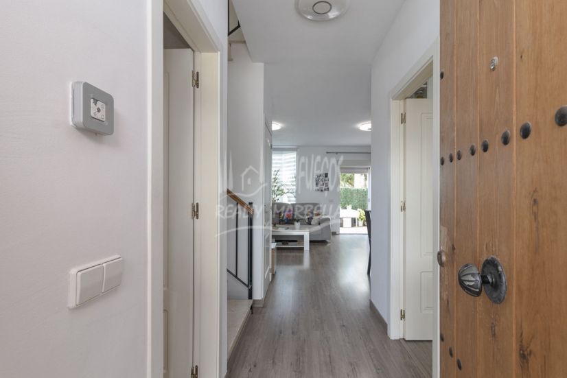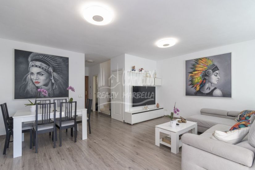 Beautiful townhouse in Selwo, Estepona. The house has 162 square meters of built area. Upon entering, the first floor features a full guest toilet, a fully equipped separate kitchen, a spacious living-dining room with a fireplace, and access to a beautiful terrace of approximately 28 square meters.