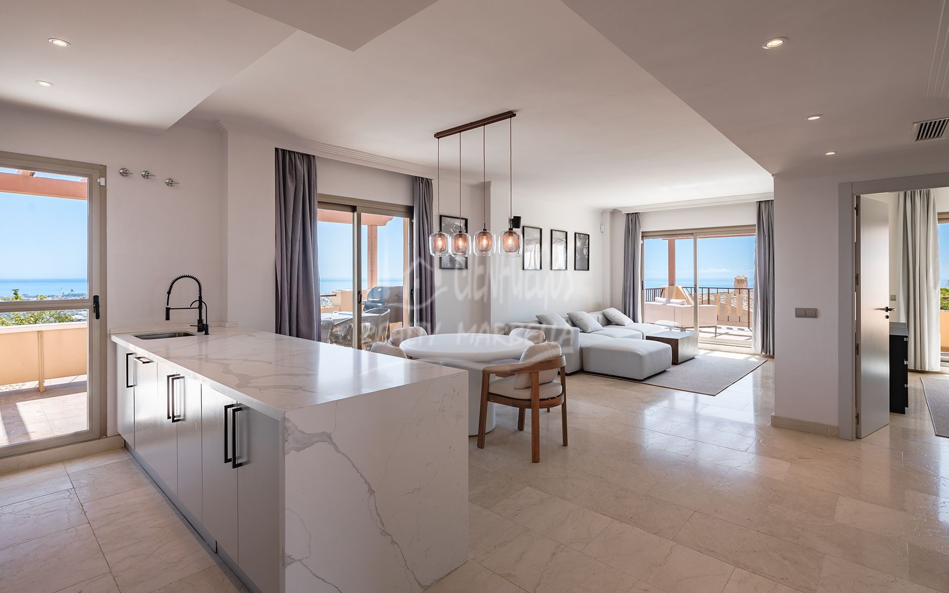 Espectacular ático de una planta disfrutando de vistas panorámicas al mar y a la montaña en La Alquería, Benahavís. Todo en un nivel, la propiedad consta de: hall de entrada; salón / comedor con acceso a dos terrazas: una orientada al sureste con vistas a la montaña de La Concha, campo de golf Atalaya, y el mar, y una orientada al sur / suroeste con vistas panorámicas al mar, Gibraltar, y el norte de África; cocina americana totalmente equipada con electrodomésticos Siemens de primera calidad; dormitorio principal en suite con acceso a la terraza; y 2 dormitorios que comparten un baño. Características adicionales incluyen: Seguridad 24 horas y servicio de conserjería; cámaras de circuito cerrado de televisión en todo; Internet de alta velocidad (fibra óptica 100Mb); A / C caliente y frío; calefacción por suelo radiante en todo; barbacoa de gas. Situado en una zona tranquila a sólo 15 minutos en coche de Puerto Banús y la playa.