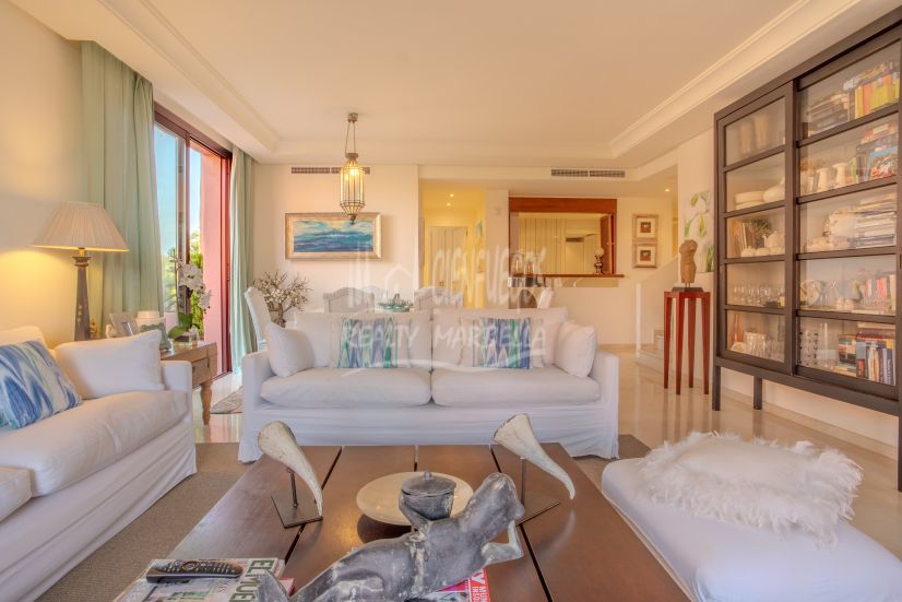 Impresionante ático dúplex de tres dormitorios orientado al sur en la prestigiosa y cerrada comunidad frente a la playa Menara Beach, Estepona. Este complejo con jardines tropicales bien cuidados, piscina comunitaria al aire libre, piscina cubierta climatizada y gimnasio, así como a solo diez minutos en coche de Puerto Banús y a poca distancia de tiendas, restaurantes y todas las comodidades. La propiedad tiene una sala de estar y comedor con puertas de patio que conducen a dos terrazas privadas con hermosas vistas al mar; cocina totalmente equipada con zona de lavandería independiente; suite de invitados con acceso a la terraza; dormitorio de invitados; y un baño de invitados. El nivel superior conduce a la impresionante suite principal con techos abovedados y una terraza privada; en este nivel hay una amplia terraza adicional con zona de barbacoa y vistas impresionantes de la comunidad y el mar. Otras características incluyen armarios empotrados en todas partes, suelos de mármol, aire acondicionado frío y caliente, calefacción por suelo radiante en los baños, aparcamiento privado y trastero.