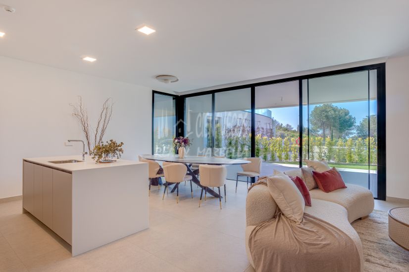 Impresionante apartamento en planta baja con orientación sur situado en el exclusivo complejo residencial de Marbella Sunset en Cabopino. Esta casa contemporánea combina un diseño moderno con comodidad y elegancia, con una amplia terraza privada ideal para relajarse o disfrutar de la cena al aire libre bajo el sol mediterráneo. La propiedad ofrece tres dormitorios y tres baños. La cocina totalmente equipada está terminada con materiales de alta calidad y diseñada para estilo y funcionalidad. El luminoso y espacioso salón-comedor se conecta perfectamente con la terraza y el espacio exterior, creando una acogedora experiencia de vida interior-ordenada. Otras características incluyen aire acondicionado frío y caliente y dos plazas de aparcamiento privadas. El complejo residencial cuenta con hermosos jardines y piscinas, proporcionando un ambiente exclusivo y tranquilo. La zona también ofrece una gran selección de servicios cercanos, incluyendo restaurantes, escuelas, la playa y campos de golf, haciendo de esta propiedad una opción ideal tanto para vivir permanente como para un segundo hogar.