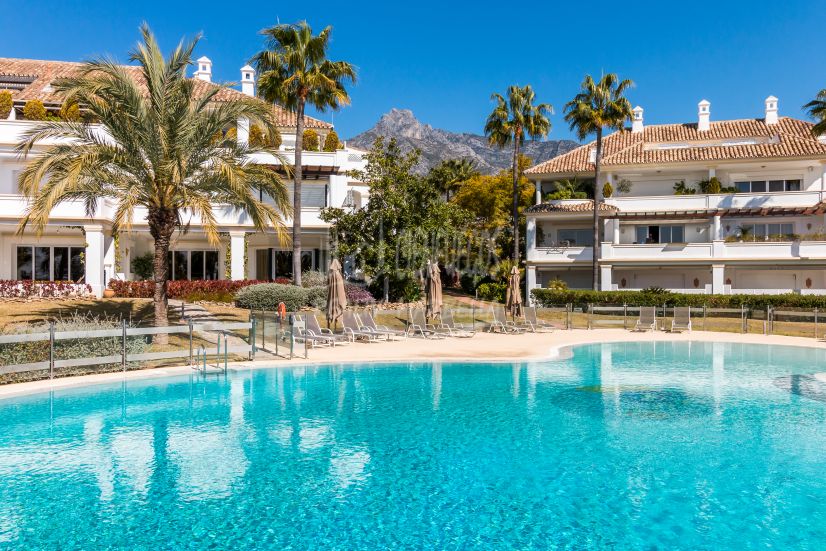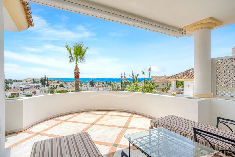 Maravilloso ático dúplex orientado al sureste en la exclusiva y cerrada comunidad de Monte Paraíso en la Milla de Oro, con seguridad 24 horas, varias piscinas al aire libre, un bar/restaurante, zona de juegos infantiles, gimnasio totalmente equipado, sala de vapor, sauna, cancha de calabaza, sala de masajes, piscina cubierta climatizada y jardines tropicales que se mantienen a los más altos estándares. Además de todo esto, se encuentra a pocos pasos del famoso Hotel Puente Romano y de la playa. El nivel principal de la propiedad tiene una gran sala de estar y comedor con puertas de patio que conducen a la amplia terraza con increíbles vistas al mar; una cocina totalmente equipada con lavadero independiente; dos dormitorios, uno con una terraza privada con impresionantes vistas a la montaña La Concha; y un baño de invitados. El nivel superior conduce a la suite principal con techos abovedados, un baño de jacuzzi y acceso a una terraza privada con espectaculares vistas al mar. Otras características incluyen suelos de mármol, chimenea, armarios empotrados, aire acondicionado frío y caliente, dos espacios de estacionamiento privados y un trastero.
