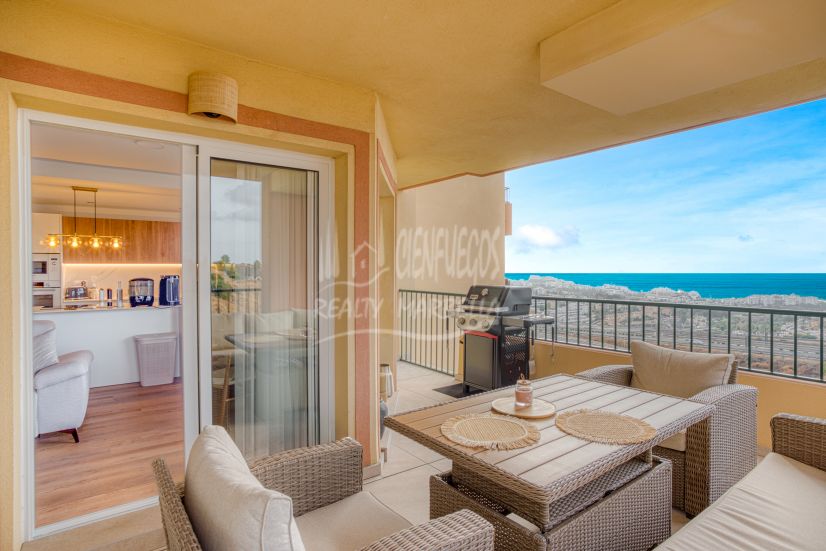 Impecable apartamento de dos dormitorios con orientación sur, situado en la comunidad cerrada de Terrazas del Sol, un complejo muy bien mantenido en la parte superior de Riviera del Sol. Los residentes disfrutan del acceso a una gran piscina comunitaria y exuberantes jardines ajardinados. A solo media hora en coche del aeropuerto de Málaga, con una parada de autobús cerca más la propiedad está también cerca de pistas de tenis, campos de golf, restaurantes y tiendas. La propiedad está totalmente reformada y diseñada para vivir moderna con un luminoso salón y cocina de planta abierta; dormitorio principal; baño de invitados; y una terraza privada con impresionantes vistas panorámicas al mar; perfecto para relajarse y ver el atardecer. Otras características incluyen una nueva unidad AC, plaza de aparcamiento privado y lavadero seperte.