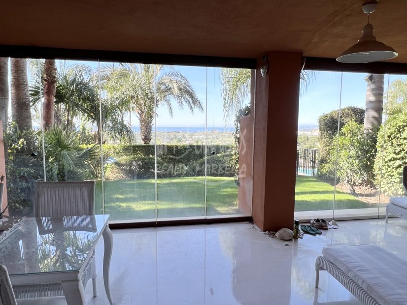 Hay 3 campos de golf de Los Flamingos a solo unos minutos a pie de la urbanización, cuyos dueños también pueden utilizar los servicios del hotel de 5 estrellas, Villa Padierna Palace Hotel. Este apartamento está ubicado en una de las urbanizaciones más exclusivas y lujosas de Los Flamingos. Este complejo prestigioso ofrece muchas oportunidades para las personas que aman la paz, la relajación, la gastronomía y la naturaleza. El proyecto combina la elegancia de un estilo arquitectónico tradicional con elementos de arquitectura contemporánea. Este apartamento en planta baja tiene la siguiente distribución: hall de entrada: espacio privado con 2 dormitorios y 2 baños: el dormitorio principal tiene un vestidor integrado: cocina moderna con electrodomésticos y acceso a una pequeña terraza, sala de estar con salón, comedor y chimenea. – Acceso a la terraza cubierta de 40 m², con una hermosa vista sobre la piscina, el mar y el campo de golf contiguo. Este apartamento también tiene una plaza de aparcamiento cerrado y un trastero. Terraza privada y terraza cubierta con jardín y jardín privado. Frente al sur y vista sobre la piscina y el mar. ¡La terraza es con cortinas de cristal, para disfrutar del clima mediterráneo durante todo el año! Jardín comunitario Hermoso jardín con gran piscina con tumbonas rodeadas de jardines verdes, palmeras y una hermosa vista sobre el mar, campo de golf y las montañas. Es perfecto como unas vacaciones o un hogar a largo plazo, y tiene un alto potencial de alquiler para aquellos que buscan potencial de inversión.