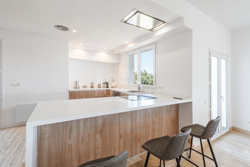 El espacio exterior es igualmente espectacular, con una piscina privada perfecta para disfrutar del cálido clima de la Costa del Sol. El jardín que rodea la propiedad agrega un toque natural y de privacidad, con un bar y zona de barbacoa ideales para el entretenimiento al aire libre y cenas al atardecer.