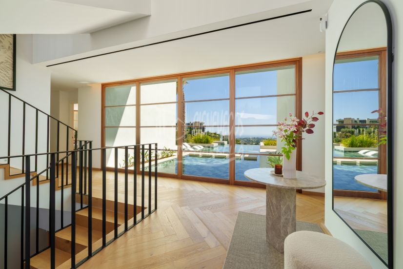 Villa Cina disfruta de una posición privilegiada, ofreciendo vistas panorámicas de 360º al mar, las montañas y los campos de golf. A pesar de su entorno tranquilo, la villa cuenta con fácil acceso a tiendas de diseño, playas de arena, campos de golf de campeonato y los vibrantes núcleos urbanos de Marbella y Puerto Banús, a solo unos minutos en coche.Esta elegante villa de 5 dormitorios ha sido diseñada de manera individual y cuenta con baños en suite, amplias y luminosas zonas de estar con chimenea, y una cocina de última generación. La suite principal dispone de una terraza orientada al sur, mientras que los cuatro dormitorios de invitados también cuentan con baños en suite. Otros aspectos destacados incluyen una bodega, sala de entretenimiento, gimnasio, sala de masajes, tres aseos para invitados, lavandería con cuatro máquinas y, ahora, un ascensor privado que aporta comodidad y accesibilidad a la vida diaria.
