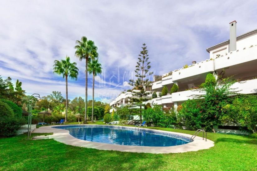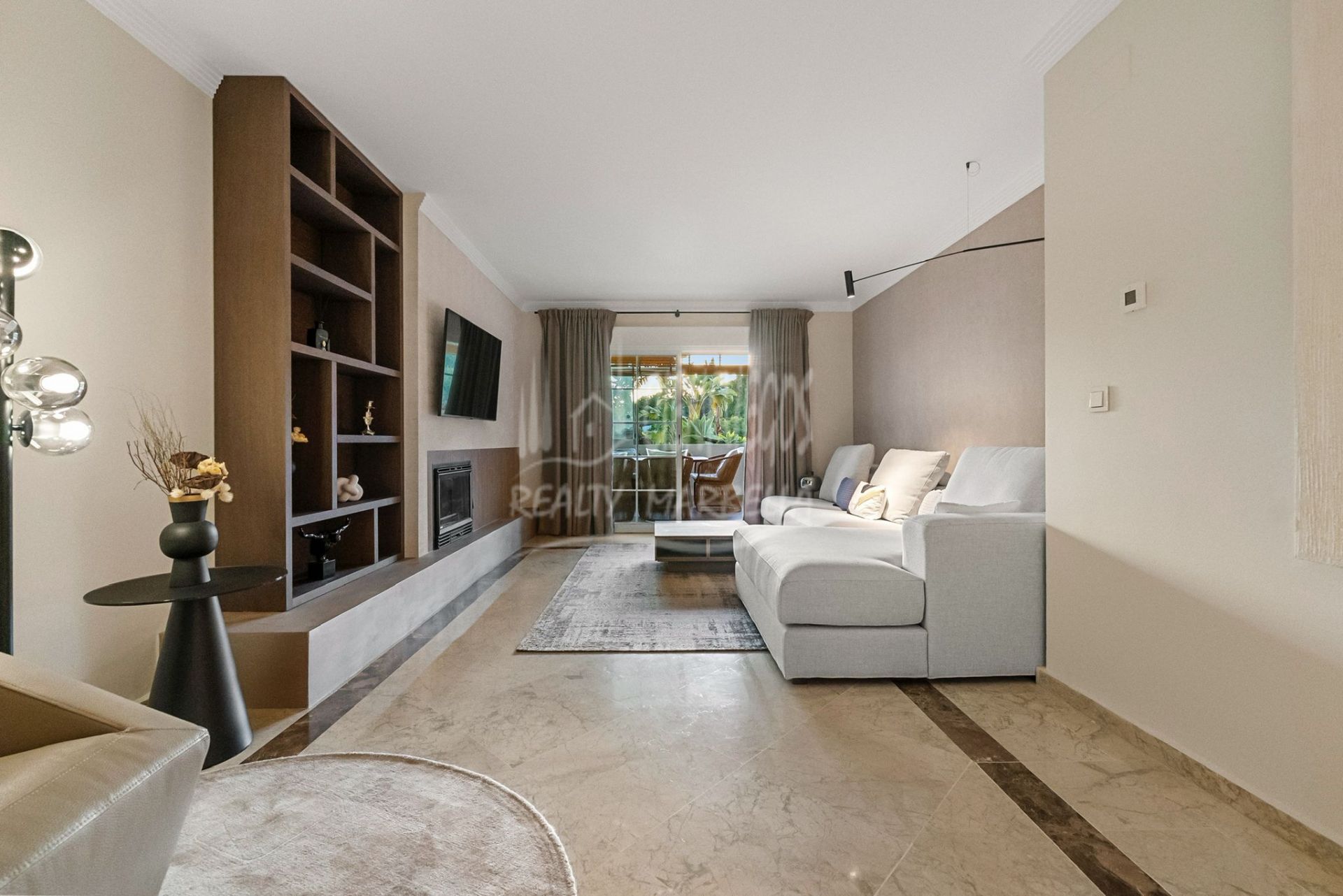 Este apartamento recientemente renovado cuenta con un amplio salón-comedor de planta abierta, bañado por luz natural, que se abre a una terraza privada con serenas vistas a los jardines y la piscina.