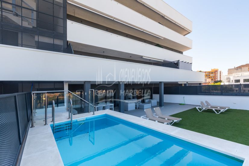 La vivienda consta de 3 dormitorios con su enorme y exclusiva terraza de casi 200 m2 y se encuentra en la cuarta planta. Tiene una superficie de 115 m2 construidos de vivienda más una espectacular terraza de 193 m2 y piscina privada, con la particularidad de que todos los dormitorios y el salón tienen acceso directo a la terraza, en ella podemos disfrutar de una terraza cubierta para los días de invierno y otra al al aire libre mucho más amplia con piscina privada para los días veraniegos. La cocina está abierta al salón, dando continuidad al espacio a la vez que iluminación, está amueblada y con todo el equipamiento de alta gama. Además de los 3 dormitorios y los 2 cuartos de baño (uno de ellos en-suite), también hay una habitación reservada como lavandería.